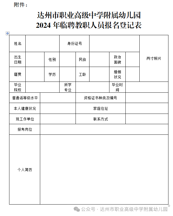 附件:达州市职业高级中学附属幼儿园2024年临聘教职人员报名登记表