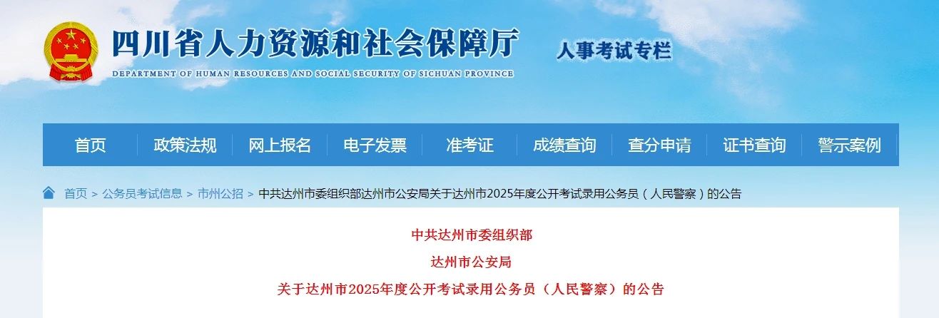根据《中华人民共和国公务员法》《中华人民共和国人民警察法》《公务员录用规定》等法律法规,经中共四川省委组织部、四川省公安厅批准,中共达州市委组织部、达州市公安局将组织实施2025年度公开考试录用公务员(人民警察)工作。现将有关事项公告如下。