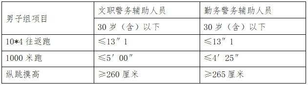 体能测试不计算分值,分为合格和不合格。测试内容为10米×4往返跑、1000米跑、纵跳摸高等三项,体能测试参照《关于印发〈公安机关录用人民警察体能测评项目和标准(暂行)〉的通知》执行。