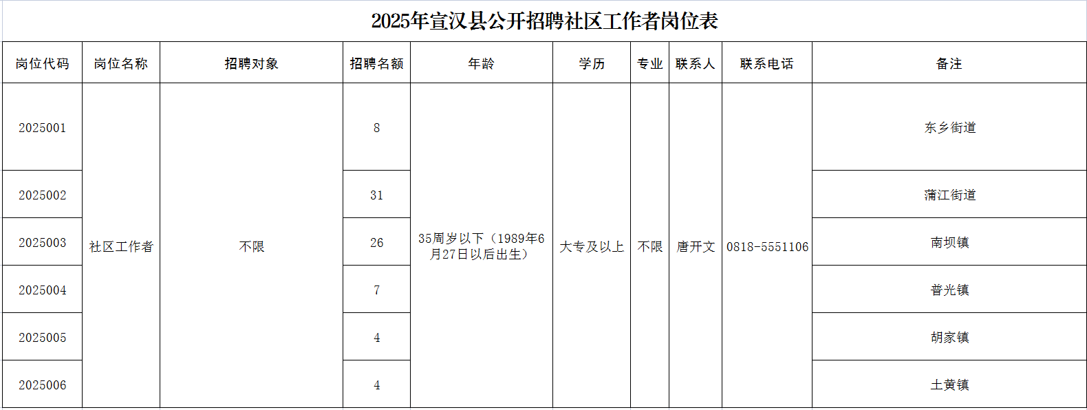 本次共招聘社区工作者80名。具体招聘岗位、名额及报考资格条件详见《2025年宣汉县公开招聘社区工作者岗位表》附件1。