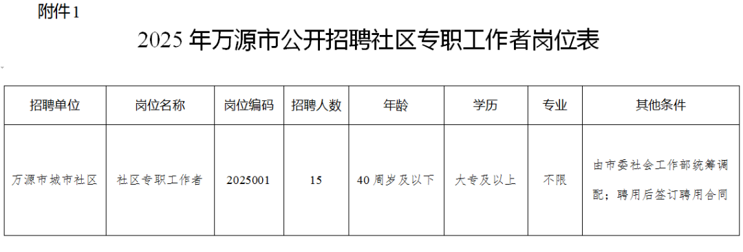 本次共招聘社区专职工作者15名,具体招聘岗位、名额及报考资格条件详见《2025年万源市公开招聘社区专职工作者岗位表》(附件1)。附件在文章最下方